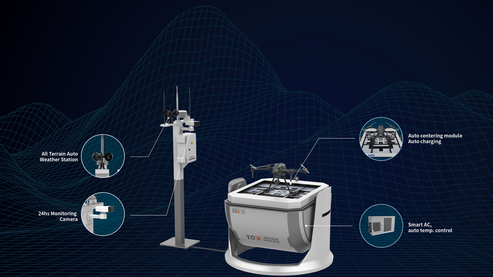 | Detail | The GDU K01 allows automatic drone takeoff. Cameras are installed inside and outside for real-time monitoring. This UAV docking station is ideal for smart cities and other comparable applications. |