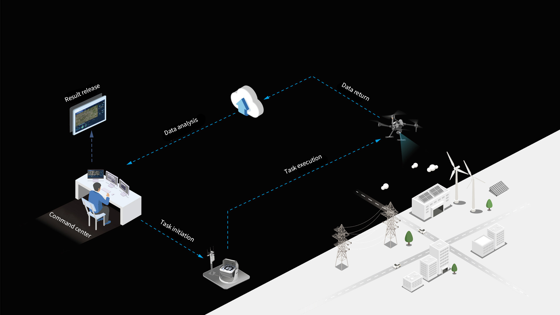 Schedule drone missions at the command center — Assign the missions to docking stations and drones — Cloud server automatically breaks down and analyzes the missions — K01 and S400E execute the missions and live stream footage or data back to the command center — Missions completed — Drones back to the stations and transfer data and analysis to the command center.
