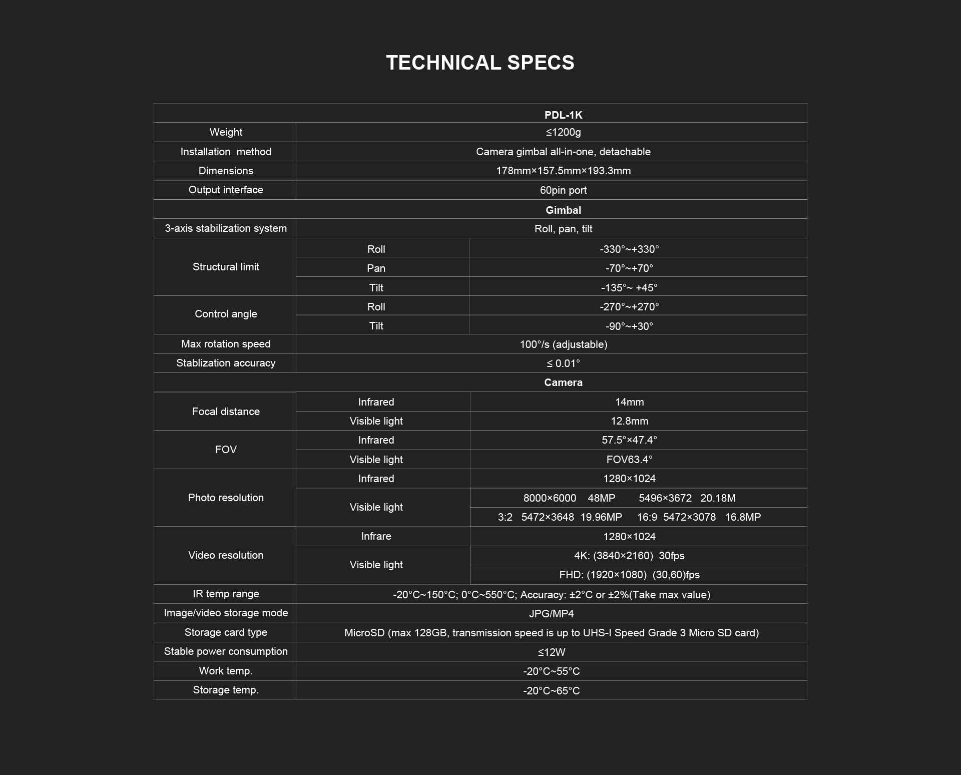 PDL1K is GDU's self-developed dual-sensor camera built with a visible camera that takes 48MP photos, and an infrared camera that features a resolution of 1280*1024, 4 times that of 640*512, allowing you to take power grid / solar panel inspection to the next level and improve AI-powered defect recognition during the day and at night.