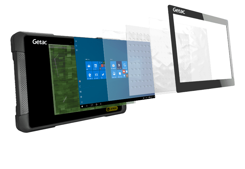 11.6" Wide Viewing Angle TFT LCD FHD (1920 x 1080) Protection film 1,000 nits LumiBond® display with Getac sunlight readable technology Capacitive multi-touch screen |